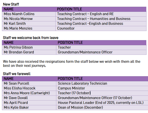 We congratulate Ms Jacinta McIntosh on her promotion to Acting Dean of Student Wellbeing and Mr Matthew Harrison on Acting House Pastoral Leader – Healy as Ms Joanne Brasch-McPhee takes Long Service Leave. This term we welcome several staff to our College and others back from leave.